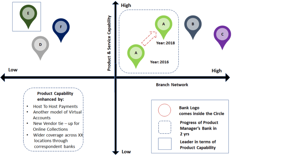 Positioning illustration: In this example, Bank A is that of the Product Manager, Bank E is the Market Leader in terms of Product Capability and Bank C is the bank with the largest branch network. A two-year time frame has been taken to show the progress of bank A. The graph also contains specifics of additions to the Product Portfolio over this period. The gap between Bank E & Bank A on the Y – axis is to be bridged going forward and the future roadmap should focus on the same.